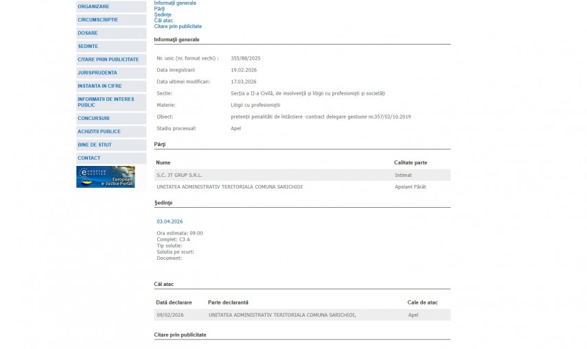 Pe rolul Curții de Apel Constanța se află dosarul 355/88/2025, înregistrat la data de 19 februarie 2026 la Secţia a II-a Civilă de insolvenţă şi litigii cu profesionişti şi societăţi ce are ca obiect „ pretenţii penalităti de întârziere -contract delegare gestiune nr.357/02/10.2019 “. Procesul se află în stadiul de apel, iar ultima modificare a fost operată în data de 19 februarie 2026.Părți în dosar sunt SC JT Grup SRL – intimat și UAT Comuna Sarichioi – Apelant Pârât.