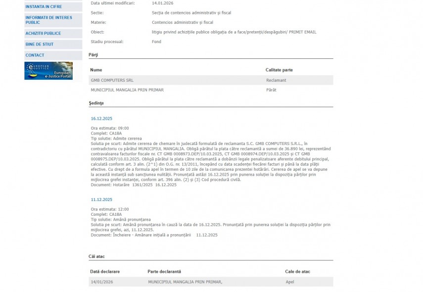 Pe rolul Tribunalului Constanța a fost înregistrat la data de 11 noiembrie 2025 dosarul 5693/118/2025 la Secţia de contencios administrativ şi fiscal, ce are ca obiect „ litigiu privind achiziţiile publice obligaţia de a face/pretenţii/despăgubiri/ PRIMIT EMAIL “. Procesul se află în stadiul de fond, iar ultima modificare a fost operată în data de 22 decembrie 2025.Părți în dosar sunt GMB Computers - Reclamant și Municipiul Mangalia prin Primar - pârât.