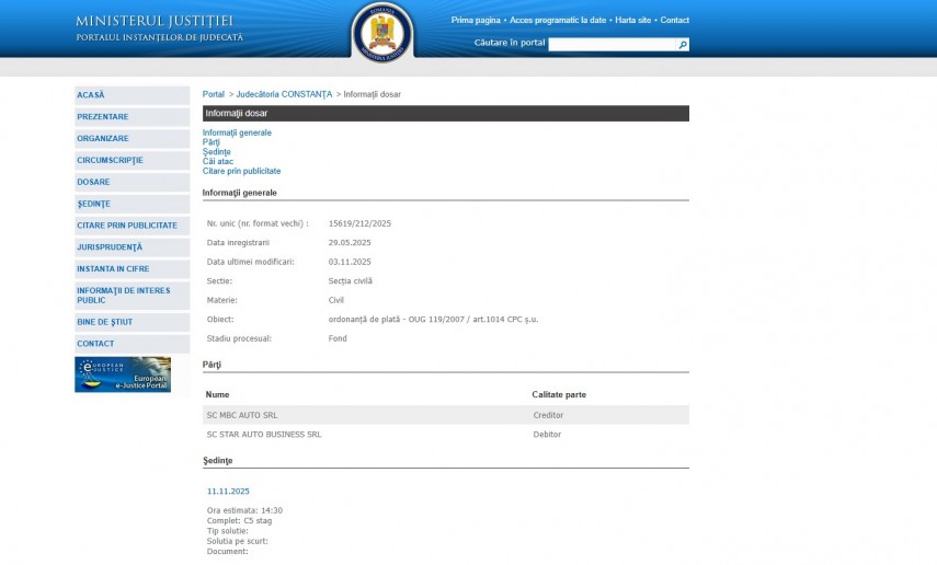 Pe rolul Judecătoriei Constanța se află dosarul 15619/212/2025, înregistrat la data de 29 mai 2025 la Secţia Civilă ce are ca obiect „ ordonanţă de plată - OUG 119/2007 / art.1014 CPC ş.u. “. Procesul se află în stadiul de fond, iar ultima modificare a fost operată în data de 25 august 2025.Părți în dosar sunt SC MBC Auto SRL – creditor și SC Star Auto Business SRL – debitor.