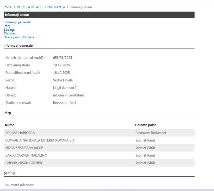 Potrivit informațiilor publice din portalul instanțelor de judecată reclamant în acest dosar este Șorlea Marioara, iar intimați pârâți sunt Compania Națională Loteria Română SA, alături de Moga Sebastian Iacob, Barbu Carmen Mădălina și Gheorghișor Carmen.