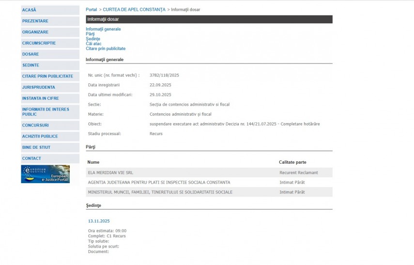 Pe rolul Curții de Apel Constanța se află dosarul 3782/118/2025, înregistrat la data de 22 septembrie 2025 la Secţia de contencios administrativ si fiscal ce are ca obiect „suspendare executare act administrativ Decizia nr. 144/21.07.2025 - Completare hotărâre“. Procesul se află în stadiul de recurs, iar ultima modificare a fost operată în data de 29 octombrie 2025.Părți în dosar sunt Ela Meridian Vie SRL - recurent Reclamant, Agenția Județeană pentru Plăți și Inspecție Socială Constanța- Intimat Pârât și Ministerul Muncii, Familiei, Tineretului și Solidarității Sociale - Intimat Pârât.
