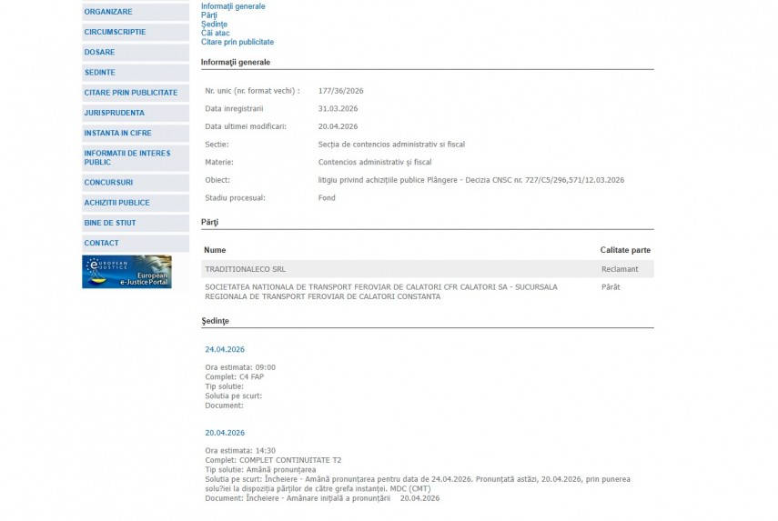 Pe rolul Curții de Apel Constanța a fost înregistrat la data de 31 martie 2026 dosarul 177/36/2026. Acesta se află în atenția Secției de Contencios Administrativ și Fiscal și are obiectul „litigiu privind achiziţiile publice Plângere - Decizia CNSC nr. 727/C5/296,571/12.03.2026“. Stadiul procesual este fond.Părți în dosar sunt Traditionaleco SRL – reclamant și Societatea Națională de Transport Feroviar de Călători CFR Călători SA - Sucursala Regională de Transport Feroviar de Călători Constanța – pârât.
