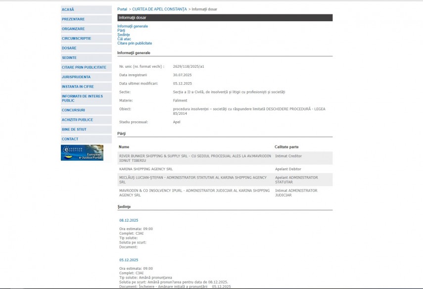 Pe rolul Curții de Apel Constanța se află dosarul 2629/118/2025/a1, înregistrat la data de 30 iulie 2025 la Secţia a II-a Civilă, ce are ca obiect „procedura insolvenţei – societăţi cu răspundere limitată DESCHIDERE PROCEDURĂ - LEGEA 85/2014“. Procesul se află în stadiul de apel, iar ultima modificare a fost operată în data de 5 decembrie 2025.Părți în dosar sunt River Bunker Shipping & Supply SRO cu Sediul Procesual Ales La Av.Mavrodin Ionut Tiberiu – intimat creditor și Karina Shipping Agency SRL- debitor, Karina Shipping Agency SRL prin administrator statutar Miclăuș Lucian-Ștefan - apelant administrator statutar și Karina Shipping Agency SRL prin administrator judiciar Mavrodin & CO Insolvency IPURL - intimat administrator judiciar.