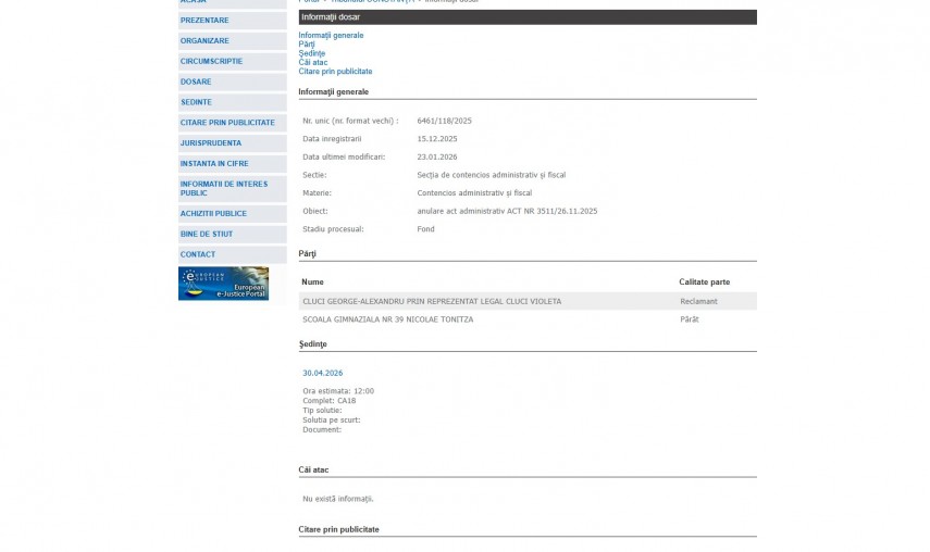 Pe rolul Tribunalului Constanța a fost înregistrat dosarul 6461/118/2025 la data de 15 decembrie 2025. Dosarul a fost înregistrat la Secţia de contencios administrativ şi fiscal și are ca obiect „ anulare act administrativ ACT NR 3511/26.11.2025“. Dosarul este în stadiul procesual – fond și ultima modificare a fost efectuată la data de 23 ianuarie 2026.Părți în dosar sunt Cluci George Alexandru prin reprezentant legal Cluci Violeta– reclamant și Școala Gimnazială nr. 39 Nicolae Tonitza Constanța – pârât.