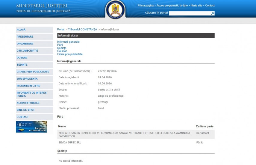 Pe rolul Tribunalului Constanța a fost înregistrat la data de 9 aprilie 2026 dosarul 2072/118/2026. Acesta se află în atenția Secției a II-a Civilă și are obiectul „pretenții “. Stadiul procesual este Fond.Părți în dosar sunt Med Art Saglik Hizmetleri Ve Kuyumculuk Sanayi Ve Ticaret LTD.STI cu sed.ales la AV.Minuca Parvulescu – reclamant și Sevda Impex SRL – pârât.