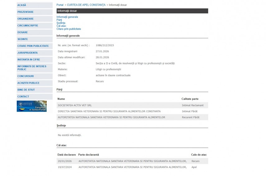 Pe rolul Curții de Apel Constanța se află dosarul cu numărul de înregistrare 1086/212/2023 înregistrat la data de 27 ianuarie 2026 la Secția a II-a Civilă, de insolvenţă şi litigii cu profesionişti şi societăţi. Dosarul are ca obiect - acțiune în daune contractuale și se află în stadiul procesual de recurs.Părți în dosar sunt Societatea Activ Vet SRL– intimat reclamant și Direcția Sanitară Veterinară și pentru Siguranța Alimentelor Constanța - Intimat Pârât și Autoritatea Națională Sanitară Veterinară și pentru Siguranța Alimentelor - Recurent Pârât.