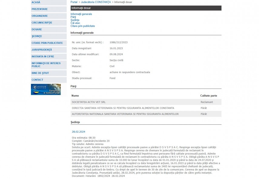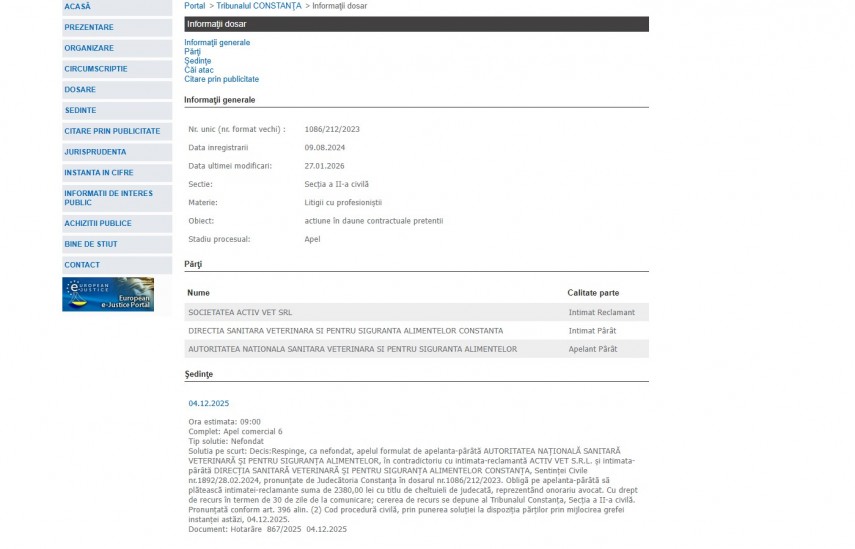 „Solutia pe scurt: Decis:Respinge, ca nefondat, apelul formulat de apelanta-pârâtă AUTORITATEA NAŢIONALĂ SANITARĂ VETERINARĂ ŞI PENTRU SIGURANŢA ALIMENTELOR, în contradictoriu cu intimata-reclamantă ACTIV VET S.R.L. şi intimata-pârâtă DIRECŢIA SANITARĂ VETERINARĂ ŞI PENTRU SIGURANŢA ALIMENTELOR CONSTANŢA, Sentinţei Civile nr.1892/28.02.2024, pronunţate de Judecătoria Constanţa în dosarul nr.1086/212/2023. Obligă pe apelanta-pârâtă să plătească intimatei-reclamante suma de 2380,00 lei cu titlu de cheltuieli de judecată, reprezentând onorariu avocat. Cu drept de recurs în termen de 30 de zile de la comunicare; cererea de recurs se depune al Tribunalul Constanţa, Secţia a II-a civilă. Pronunţată conform art. 396 alin. (2) Cod procedură civilă, prin punerea soluţiei la dispoziţia părţilor prin mijlocirea grefei instanţei astăzi, 04.12.2025“ – transmite Portalul Instanțelor de Judecată.