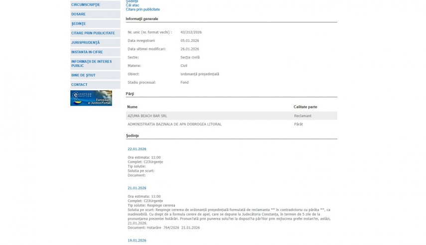 Pe rolul Judecătoriei Constanța a fost înregistrat dosarul 43/212/2026 la data de 5 ianuarie 2026 la Secţia Civilă având ca obiect „ordonanță prezidențială“. Procesul se află în stadiul de fond, iar ultima modificare a fost operată în data de 21 ianuarie 2026.În acest dosar reclamant este Azuma Beach SRL, iar ABADL este pârât.