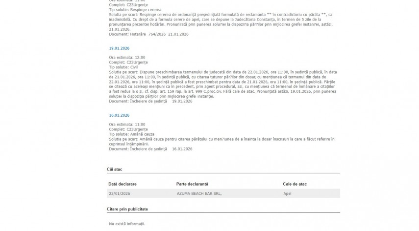 La data de 23 ianuarie 2026, Azuma Beach SRL a atacat decizia instanței cu apel. Amintim că primul termen din acest dosar a avut loc la data de 16 ianuarie 2026 când a fost amânată cauza pentru data de 22 ianuarie 2026.
