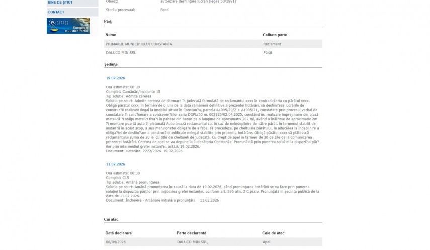 La data de 6 aprilie 2026, Daluco Min a atacat decizia Judecătoriei Constanța cu apel.Solutia pe scurt: Admite cererea de chemare în judecată formulată de reclamantul xxxx în contradictoriu cu pârâtul xxxx. Obligă pârâtul xxxx, în termen de 6 luni de la data rămânerii definitive a prezentei hotărâri, să desfiin?eze lucrările de construc?ii realizate ilegal la imobilul situat în Constan?a, parcela A1095/20/2 + A1095/21, constatate prin procesul-verbal de constatare și sancționare a contraven?iilor seria DGPL/50 nr. 002925/02.04.2025, constând în: realizare împrejmuire din plasă metalică ?i stâlpi metalici fixa?i în pahare din beton pe o lungime de aproximativ 202 ml, având o înăl?ime de aproximativ 2m ?i montare poartă auto ?i pietonală Autorizează reclamantul ca, în caz de neîndeplinire de către pârât, în termenul stabilit de instan?ă în acest scop, a sus-men?ionatei obliga?ii de a face, să procedeze, pe cheltuiala pârâtului, la aducerea la îndeplinire a obliga?iei de desfiin?are a construc?iei edificate nelegal stabilite prin prezenta hotărâre. Obligă pârâtul xxxx să plătească reclamantului suma de 20 lei cu titlu de cheltuieli de judecată. Cu drept de apel în termen de 30 de zile de la comunicarea prezentei hotărâri. Cererea de apel se va depune la Judecătoria Constan?a. Pronun?ată prin punerea solu?iei la dispozi?ia păr?ilor prin intermediul grefei instan?ei, astăzi, 19.02.2026“ - conform Portalului Instanțelor de Judecată