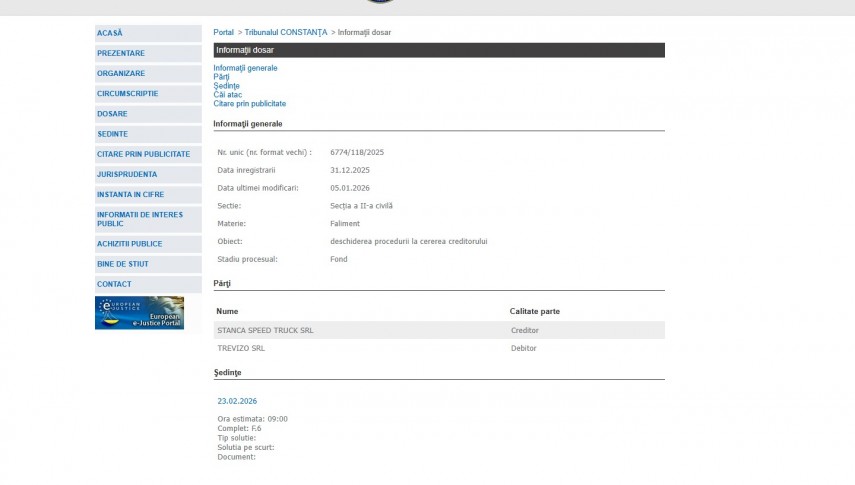 Pe rolul Tribunalului Constanța se află dosarul 6774/118/2025, înregistrat la data de 31 decembrie 2025 la Secţia a II-a Civilă ce are ca obiect „deschiderea procedurii la cererea creditorului“. Procesul se află în stadiul de fond, iar ultima modificare a fost operată în data de 31 decembrie 2025.Părți în dosar sunt Stanca Speed Truck SRL – creditor și Trevizo SRL – debitor.