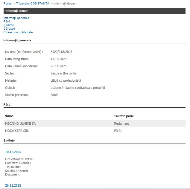 Dosarul nr. 5122/118/2025, înregistrat la Tribunalul Constanța pe 14 octombrie 2025, privește un litigiu între Mecaind Ulmeni SA, în calitate de reclamant, și Moga Star SRL, ca pârât, având ca obiect o acțiune în daune contractuale.