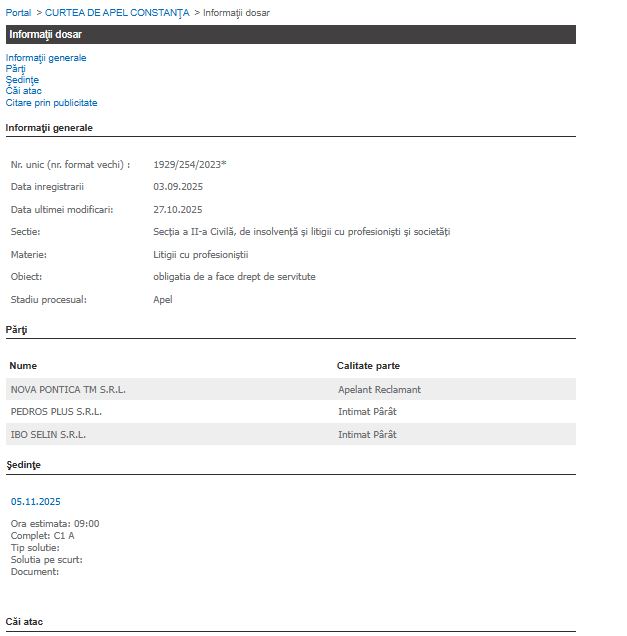 Curtea de Apel Constanța: Pe 3 septembrie 2025, dosarul a fost înregistrat la Curtea de Apel, în faza de apel, ca urmare a hotărârii Tribunalului. Aici, Nova Pontica TM SRL este înregistrată ca apelantă, iar Pedros Plus SRL și IBO Selin SRL sunt intimare.