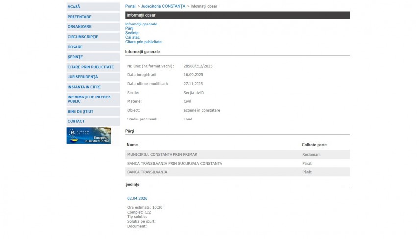 Pe rolul Judecătoriei Constanța se află dosarul 28568/212/2025, înregistrat la data de 16 septembrie 2025 la Secţia Civilă ce are ca obiect „ acţiune în constatare “. Procesul se află în stadiul de fond, iar ultima modificare a fost operată în data de 16 septembrie 2025.Părți în dosar sunt Municipiul Constanța prin Primar – reclamant și Banca Transilvania prin Sucursala Constanța, respectiv Banca Transilvania – pârâți.