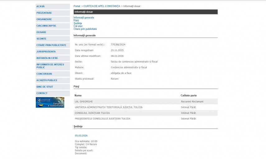 Pe rolul Curții de Apel Constanța se află dosarul cu numărul de înregistrare 770/88/2024 înregistrat la data de 20 noiembrie 2025 la Secția de Contencios Administrativ și Fiscal. Dosarul are ca obiect – obligația de a face și se află în stadiul procesual de recurs.Părți în dosar sunt Lal Gheorghe – recurent reclamant, UAT Județul Tulcea, CJ Tulcea și președintele CJ Tulcea – intimați pârâți.