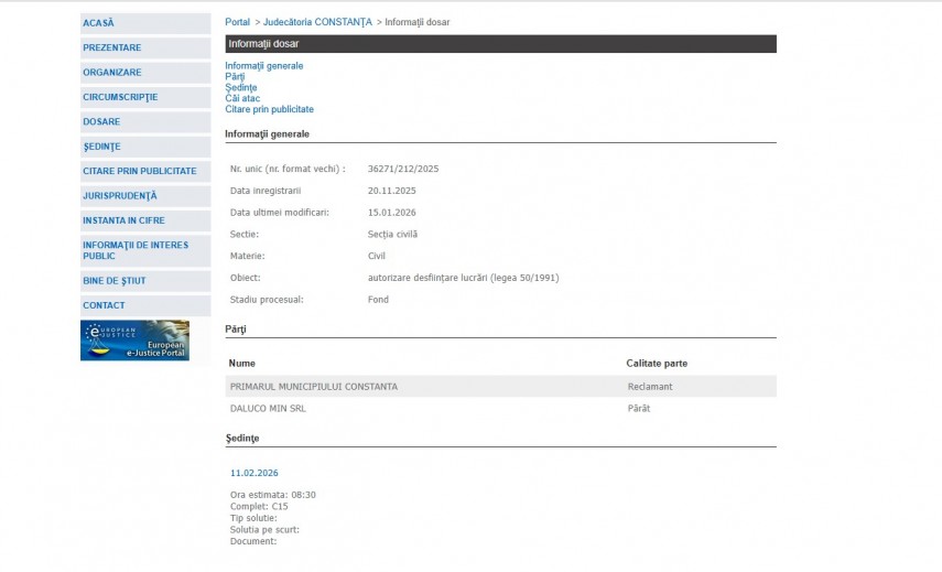 Pe rolul Judecătoriei Constanța se află dosarul cu numărul de înregistrare 36271/212/2025 la Secția Civilă. Dosarul are ca obiect autorizare desfiinţare lucrări (legea 50/1991) și se află în stadiul procesual de fond.Părți în dosar sunt Primarul Municipiului Constanța – reclamant și Daluco Min SRL – pârât.