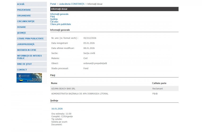 Pe rolul Judecătoriei Constanța a fost înregistrat dosraul 43/212/2026 la data de 5 ianuarie 2026 la Secţia Civilă având ca obiect „ordonanță prezidențială“. Procesul se află în stadiul de fond, iar ultima modificare a fost operată în data de 8 ianuarie 2026.În acest dosar reclamant este Azuma Beach SRL, iar ABADL este pârât.