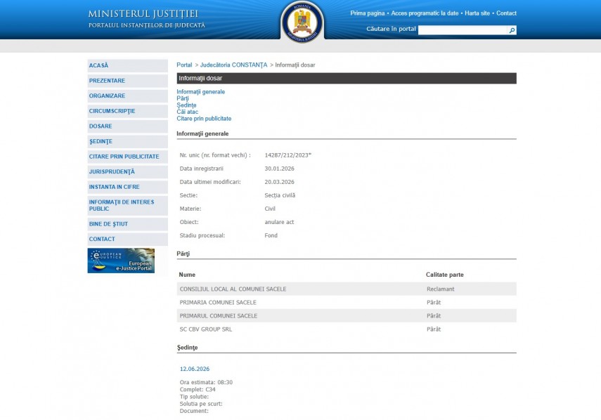 Pe rolul Judecătoriei Constanța a fost înregistrat dosarul 14287/212/2023 la data de 30 ianuarie 2026. Dosarul a fost înregistrat la Secția Civilă și are ca obiect „ anulare act“. Dosarul este în stadiul procesual – fond și ultima modificare a fost efectuată la data de 30 ianuarie 2026.Părți în dosar sunt Consiliul Local al Comunei Săcele – Reclamant, Primaria Comunei Săcele –Pârât, Primarul Comunei Săcele – Pârât și SC CBV Group SRL Pârât.