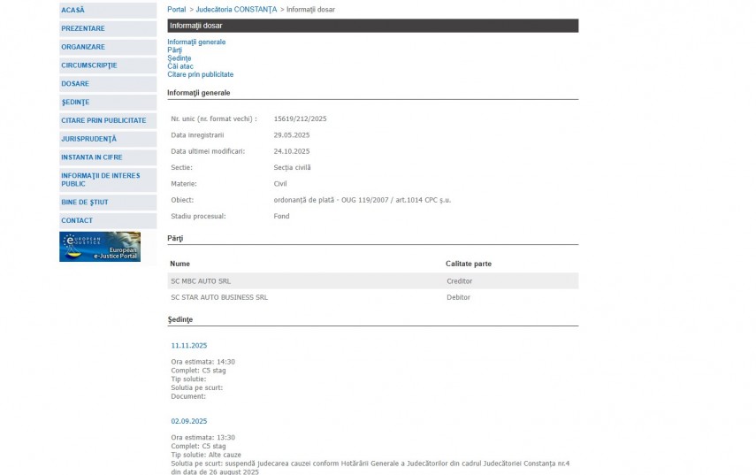 Pe rolul Judecătoriei Constanța se află dosarul 15619/212/2025, înregistrat la data de 29 mai 2025 la Secţia Civilă ce are ca obiect „ ordonanţă de plată - OUG 119/2007 / art.1014 CPC ş.u. “. Procesul se află în stadiul de fond, iar ultima modificare a fost operată în data de 25 august 2025.Părți în dosar sunt SC MBC Auto SRL – creditor și SC Star Auto Business SRL – debitor.