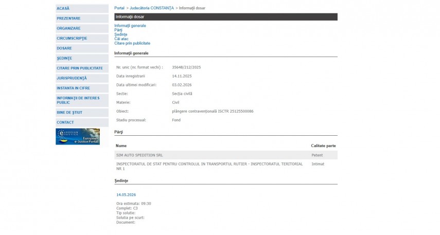Pe rolul Judecătoriei Constanța a fost înregistrat la data de 14 noiembrie 2025 a fost înregistrat dosarul 35648/212/2025 în care părți sunt Sim Auto Spedition SRL - pârât și Inspectoratul de Stat Pentru Controlul în Transportul Rutier - Inspectoratul Teritorial Nr 1- intimat.Dosarul are ca obiect plângere contravenţională ISCTR 25125500086