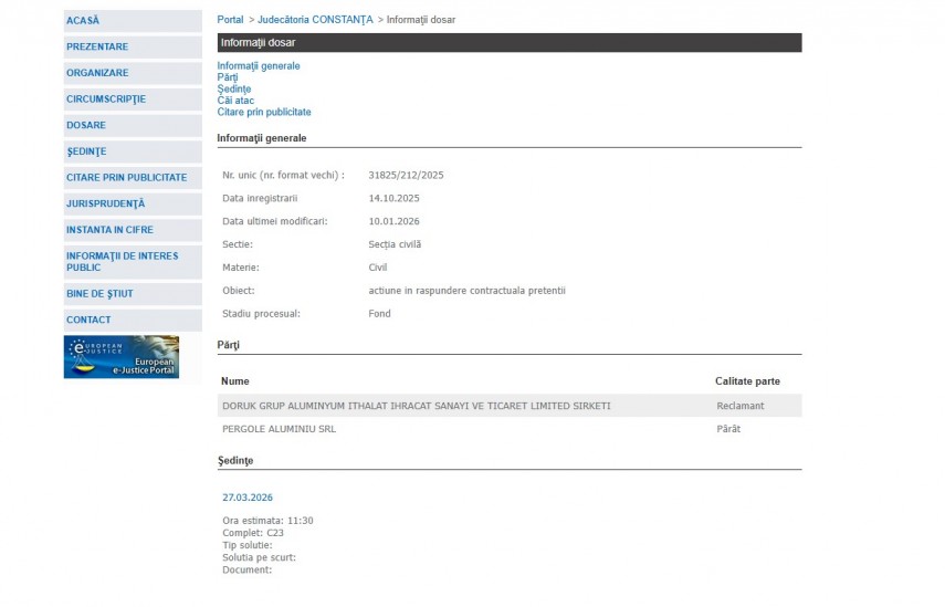 Pe rolul Judecătoriei Constanța se află dosarul 31825/212/2025, înregistrat la data de 14 octombrie 2025 la Secţia Civilă, ce are ca obiect „acțiune în răspundere contractuală pretenții“. Procesul se află în stadiul de fond, iar ultima modificare a fost operată în data de 10 ianuarie 2025.Părți în dosar sunt Doruk Grup Aluminyum Ithalat Ihracat Sanayi Ve Ticaret Limited Sirketi – Reclamant și Pergole Aluminiu – pârât.