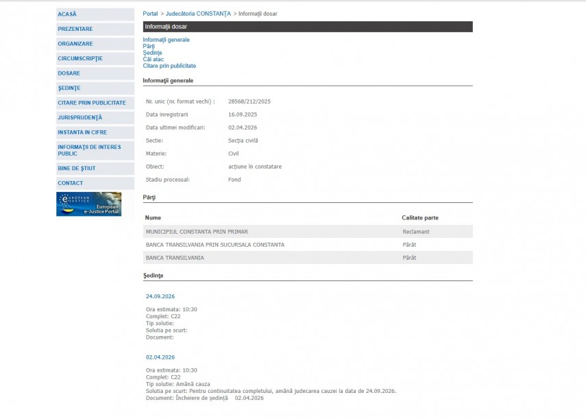 Pe rolul Judecătoriei Constanța se află dosarul 28568/212/2025, înregistrat la data de 16 septembrie 2025 la Secţia Civilă ce are ca obiect „ acţiune în constatare “. Procesul se află în stadiul de fond, iar ultima modificare a fost operată în data de 16 septembrie 2025.Părți în dosar sunt Municipiul Constanța prin Primar – reclamant și Banca Transilvania prin Sucursala Constanța, respectiv Banca Transilvania – pârâți.