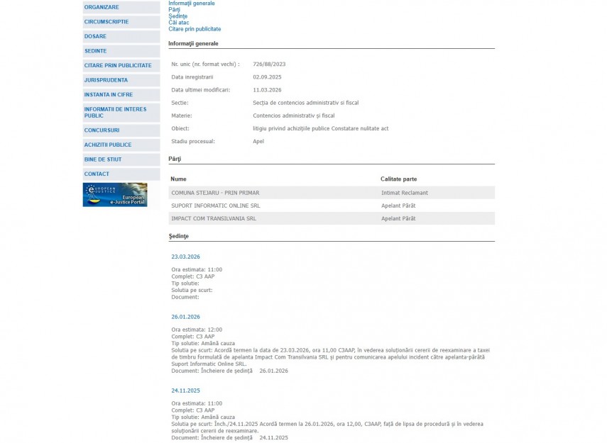 Pe rolul Curții de Apel Constanța se află dosarul 726/88/2023, înregistrat la data de 2 septembrie 2025 la Secţia de Contencios administrativ și fiscal ce are ca obiect „ litigiu privind achiziţiile publice Constatare nulitate act “. Procesul se află în stadiul de apel.Părți în dosar sunt Comuna Stejaru prin primar – Intimat Reclamant, Suport Informatic online SRL – Apelant Pârât și Impact Com Transilvania SRL – Intimat Pârât.