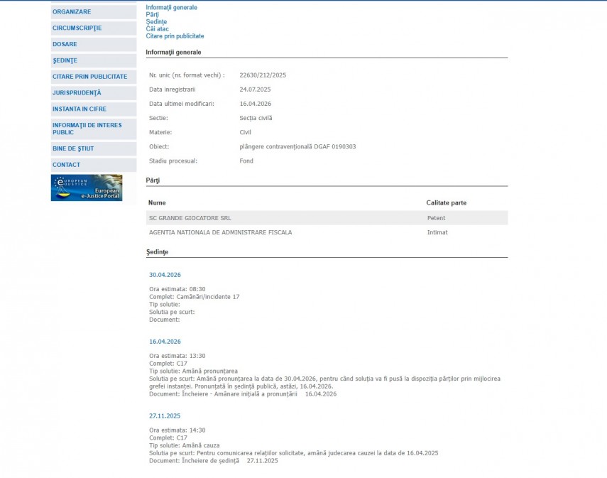 Pe rolul Judecătoriei Constanța se află dosarul 22630/212/2025, înregistrat la data de 24 iulie 2025 la Secţia Civilă, ce are ca obiect „ plângere contravenţională DGAF 0190303 “. Procesul se află în stadiul de fond, iar ultima modificare a fost operată în data de 16 octombrie 2025.Părți în dosar sunt SC Grande Giocatore SRL – petent și Agenția Națională de Administrare Fiscală – Intimat.