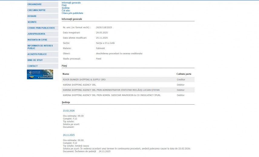 Pe rolul Tribunalului Constanța se află dosarul cu numărul de înregistrare 2629/118//2025 la Secția a II-a Civilă. Dosarul are ca obiect - deschiderea procedurii la cererea creditorului și se află în stadiul procesual de fond.Părți în dosar sunt River Bunker Shipping & Supply SRO - creditor și Karina Shipping Agency SRL- debitor, Karina Shipping Agency SRL prin administrator statutar Miclăuș Lucian-Ștefan - debitor și Karina Shipping Agency SRL prin administrator judiciar Mavrodin & CO Insolvency IPURL - debitor.