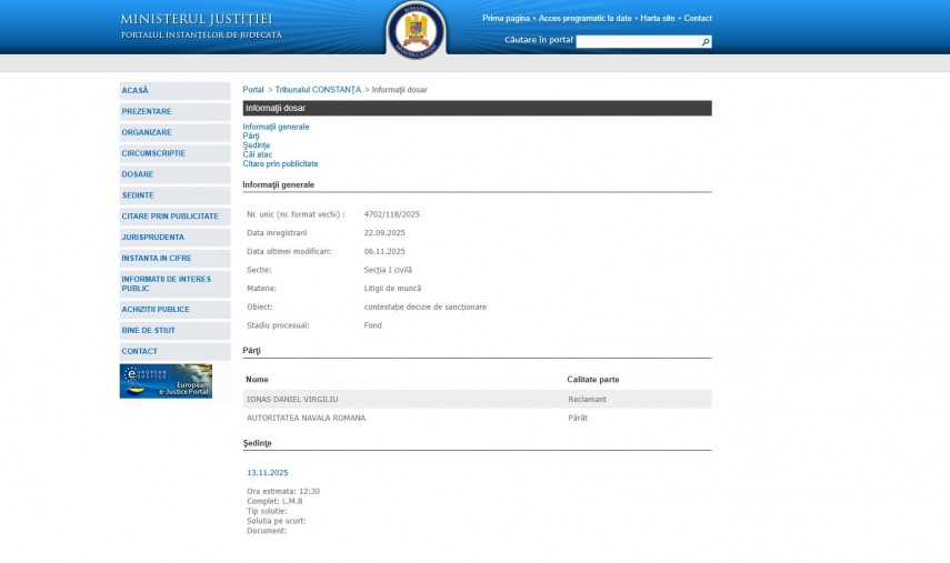 Pe rolul Tribunalului Constanța se află dosarul 4702/118/2025, înregistrat la data de 22 septembrie 2025 la Secţia I Civilă ce are ca obiect „contestaţie decizie de sancţionare“. Procesul se află în stadiul de fond, iar ultima modificare a fost operată în data de 6 noiembrie 2025.Părți în dosar sunt Ionaș Daniel Virgiliu– reclamant și Autoritatea Navală Română – pârât.