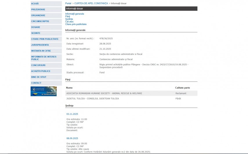 Justiție Constanța Termen pe 3 noiembrie la Curtea de Apel Constanța în procesul dintre Asociația Romanian Humane Society - Animal Rescue & Welfare și CJ Tulcea