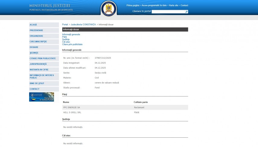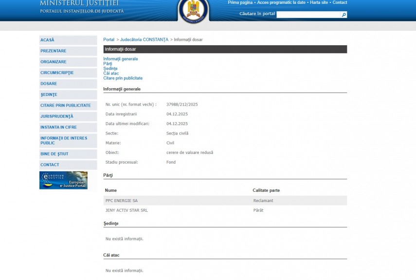 Pe rolul Judecătoriei Constanța se află trei dosare în care PPC Energie SA este reclamant. Este vorba despre trei dosare cu obiectul – cerere de valoare redusă unde pârâți sunt Quattro Presidente (37986/212/2025), Hells Grill (37987/212/2025) și Jenny Activ Star (37988/212/2025). În niciunul dintre cele trei dosare nu a fost stabilit termen de judecată, dosarele fiind înregistrate pe rolul Judecătoriei Constanța la data de 4 decembrie 2025.