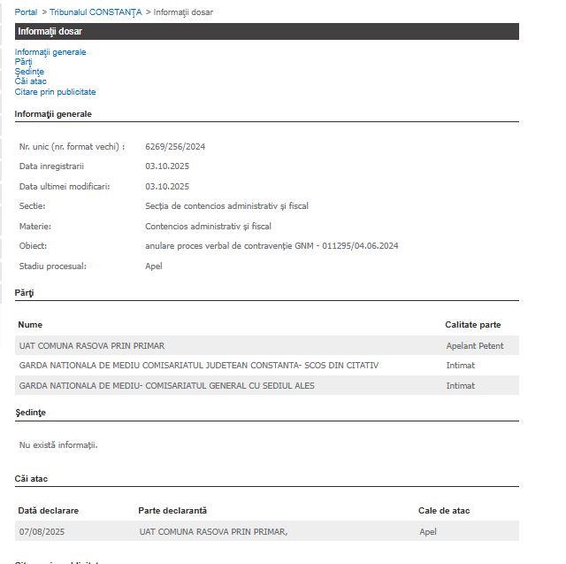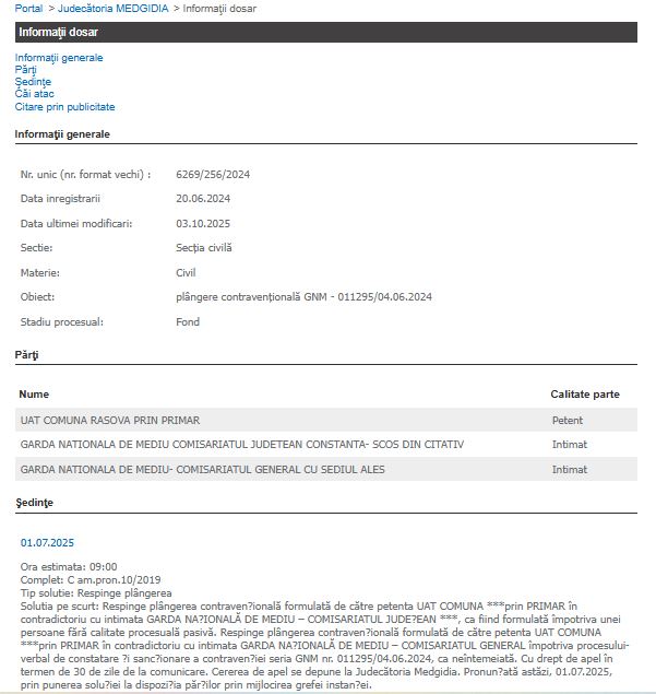 Dosarul nr. 6269/256/2024 are ca obiect anularea procesului-verbal de contravenție GNM nr. 011295 din 04.06.2024. Cu alte cuvinte, UAT Comuna Rasova este nemulțumită de o amendă a Gărzii de Mediu.