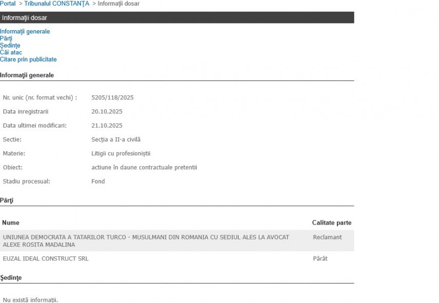 Pe 20 octombrie 2025, dosarul 5205/118/2025 a fost înregistrat pe rolul Tribunalului Constanța.