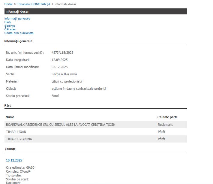 Părți în dosar sunt Boardwalk Residence SRL cu sediul ales la Avocat Cristina Toxin – reclamant și Timaru Ioan și Timaru Geanina, pârâți.