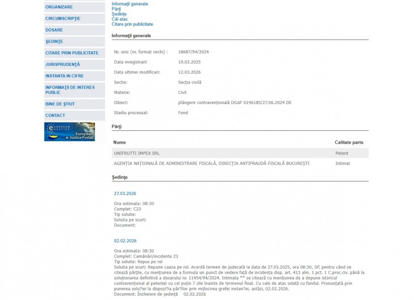 Un dosar a fost înregistrat la data de 19 martie 2025 pe rolul Judecătoriei Constanța, având ca obiect o plângere contravențională formulată de Unifrutti Impex SRL împotriva Agenției Naționale de Administrare Fiscală (ANAF) – Direcția Generală Antifraudă Fiscală (DGAF) București.Dosarul cu indicativul 18687/94/2024 are obiectul - Plângere contravențională împotriva procesului-verbal DGAF 0196185/27.06.2024 – și este în stadiul procesual de fond.