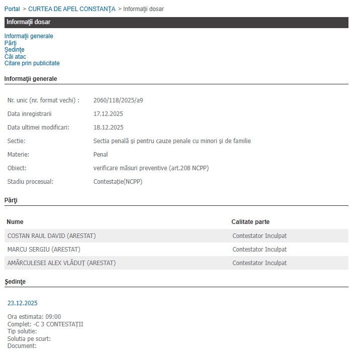 Potrivit portalului instanțelor de judecată, inculpații Costan Raul David, Marcu Sergiu și Amărculesei Alex Vlăduţ vor fi aduși din arestul preventiv în fața magistraților Tribunalului Constanța, după ce au contestat decizia Tribunalului cu privire la măsurile preventive.