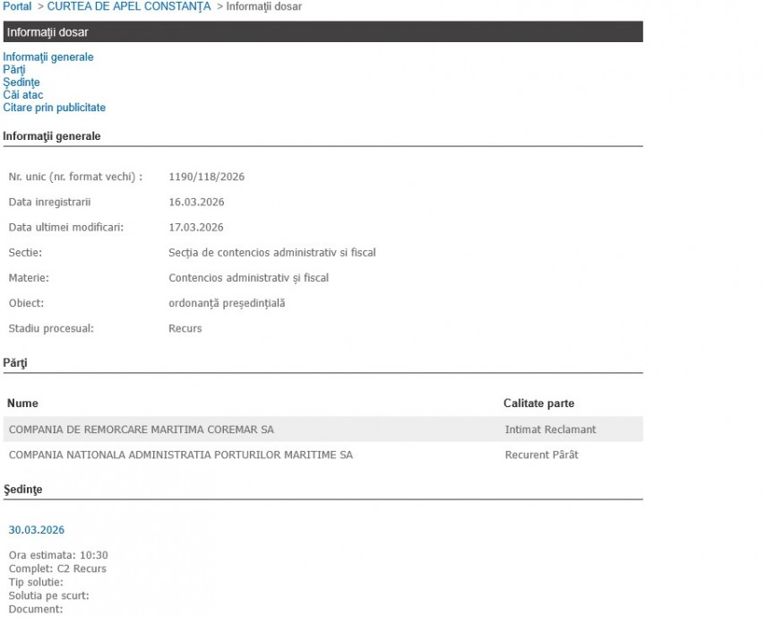 - Pe data de 30 martie 2026, Curtea de Apel Constanța va stabili dacă menține ordonanța președințială emisă de Tribunal în procesul dintre Compania de Remorcare Maritimă Coremar SA și Compania Națională „Administrația Porturilor Maritime” SA Constanța