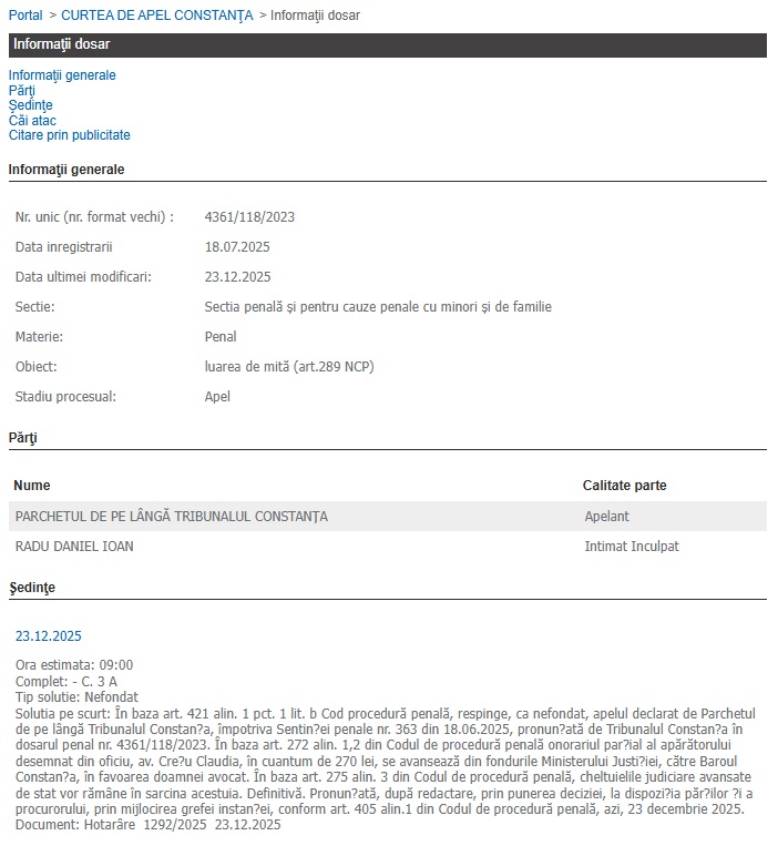 Inculpatul a contestat prima pedeapsă, iar astfel cauza a ajuns în atenția Curții de Apel Constanța, instanță care, marți 23.12.2025, a anunțat o decizie definitivă! Insatanța a respins contestația inculpatului, iar astfel, a rămas valabilă pedeapsa stabilită de instanța de fond.