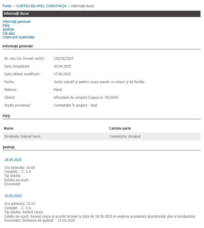 Un nou termen are loc astăzi, 18.09.2025, la Curtea de Apel Constanța, privind contestația în anulare formulată de omul de afaceri constănțean Sorin Gabriel Strutinsky, încarcerat în prezent într-un penitenciar din Italia.