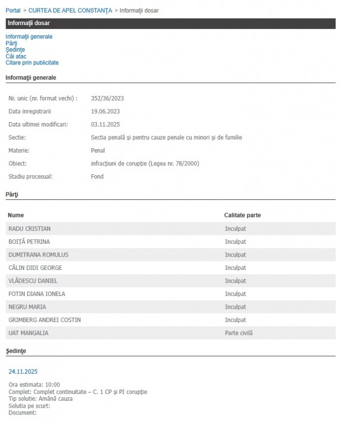 Potrivit Portalului Instanțelor de Judecată, toate părțile implicate în dosarul instrumentat de DNA sunt așteptate la un nou termen, programat luni 24.11.2025.