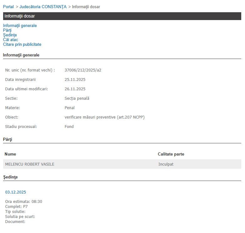 Potrivit Portalului Instanțelor de Judecată, dosarul cu indicativul 37006/212/2025 a fost înregistrat la data de 25.11.2025, iar în cursul acestei zile, 03.12.2025, instanța va stabili măsurile preventive față de inculpat.