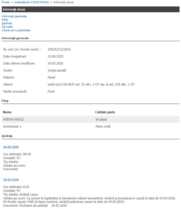 Un dosar penal în care un bărbat, pe nume Miron Vasile, a fost trimis în judecată pentru infracțiunea de tentativă la viol a înregistrat astăzi, 30 martie 2026, o nouă amânare pe rolul Judecătoriei Constanța.