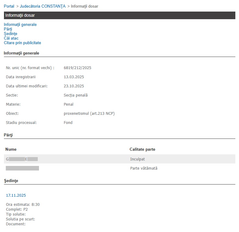 Potrivit portalului instanțelor de judecată, în dosarul cu indicativul 6819/212/2025, în proces este citată o parte vătămată. După două amânări, la data de 06.10.2025, instanța a suspendat cauza. Procesul a fost repus pe rol, iar Judecătoria a stabilit deja următorul termen în a doua jumătate a lunii noiembrie, anul curent.