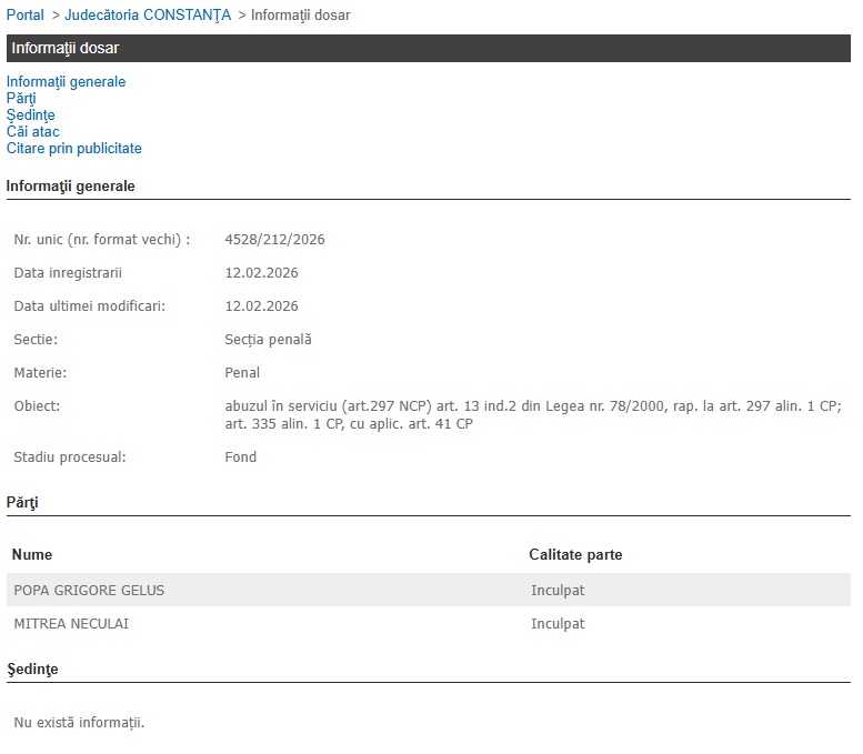 Potrivit Portalului Instanțelor de Judecată, dosarul cu indicativul 4528/212/2026 a fost înregistrat pe rolul Secției Penale din cadrul Judecătoriei Constanța joi, 12.02.2026.