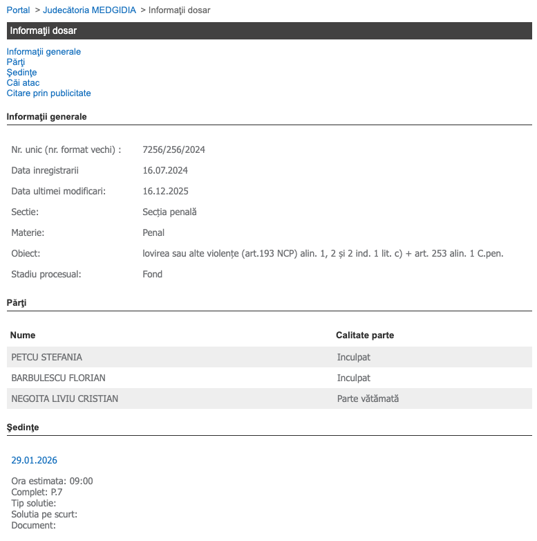 Potrivit portalului instanțelor de judecată, persoanele chemate în instanță se numesc Petcu Ștefania și Bărbulescu Florian.