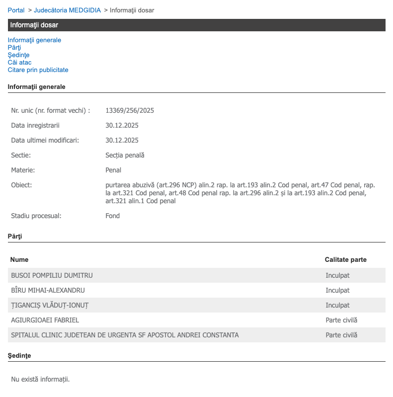 Oficial, bărbatul a fost trimis în judecată, iar potrivit Portalului Instanțelor de judecată, în dosarul cu indicativul 13369/256/2025, înregistrat marți, 30.12.2025, care are ca obiect purtarea abuzivă, alături de acesta au mai fost deferite justiției încă alte două persoane.