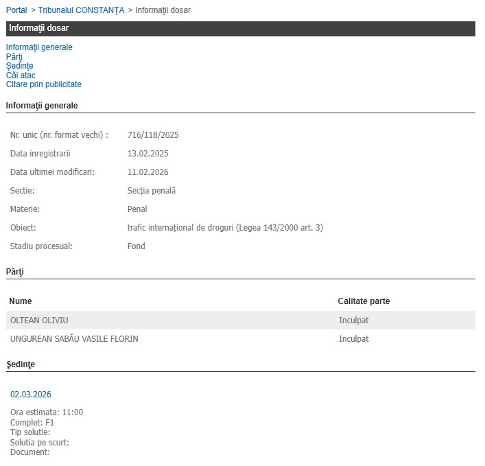 În cauză, cei deferiți justiției sunt Oltean Oliviu, Ungurean Sabău Vasile Florin, iar potrivit Portalului Instanțelor de Judecată, în cursul acestei zile, în jurul orei 11:00 sunt așteptați în fața judecătorilor.