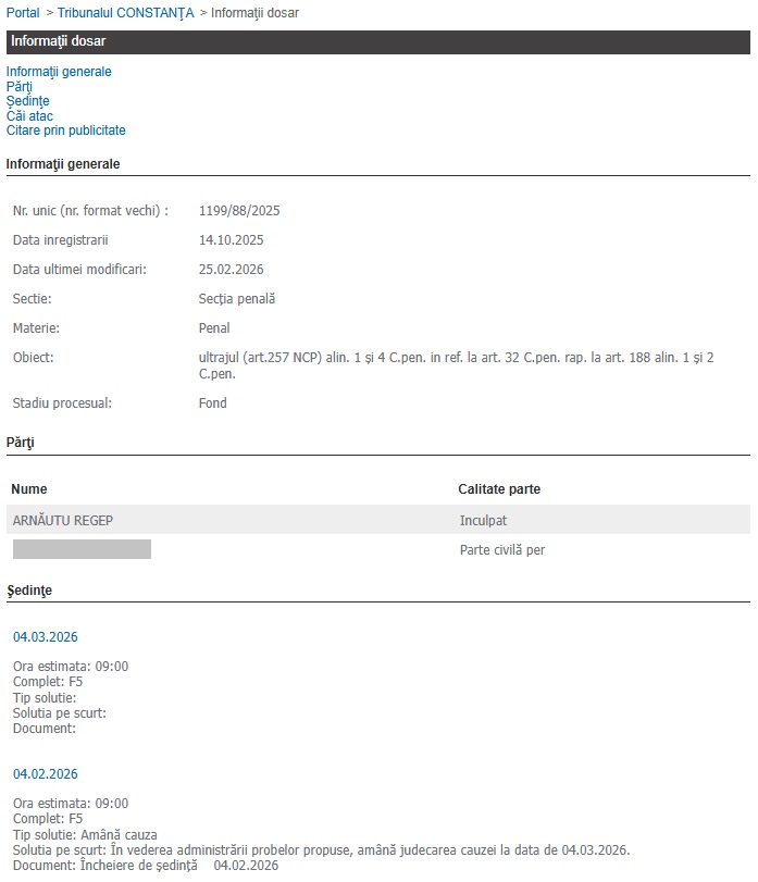 Dosarul 1199/88/2025 a fost trimis spre soluționare de la Tribunalul Tulcea către Curtea de Apel Constanța, instanță care, la data de 14.10.2025 a stabilit ca Tribunalul Constanța să judece cauza.