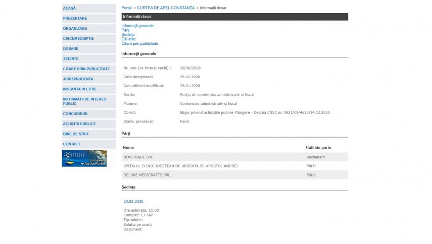 Un nou dosar de contencios administrativ și fiscal (nr. 39/36/2026) a fost înregistrat la Curtea de Apel Constanța, pe data de 26 ianuarie 2026, având ca obiect o plângere împotriva Deciziei CNSC nr. 3921/C9/4625 din 24.12.2025.Litigiul vizează o procedură de licitație deschisă organizată de Spitalul Clinic Județean de Urgență „Sf. Apostol Andrei” Constanța pentru achiziția de materiale sanitare (catetere)